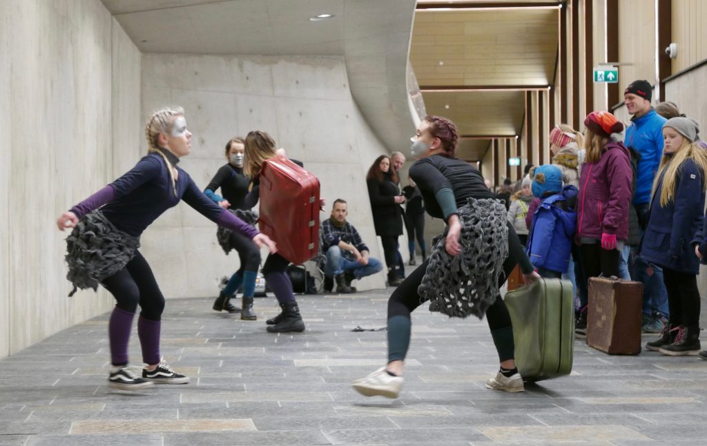In het lokale theater hebben we met alle deelnemers een aantal weekenden gerepeteerd. Twee koren, een theatergroep, dansers, de brassband, jeugdtheater en lokale rappers. En daar kwamen later nog vuurspugers en zeven graafmachine-machinisten bij. Samen met projecties binnen in de tunnels en buiten op de rotswand vertellen ze het verhaal van de berg van Holmestrand. Kleine voorstellingen in de tunnels van het station, waarna iedereen naar buiten kwam voor de ‘Grande Finale’ op het dak van het station. De berg als projectiescherm, dansende graafmachines ervoor. Vuurwerk vanaf de top van de berg. Het station is geopend!